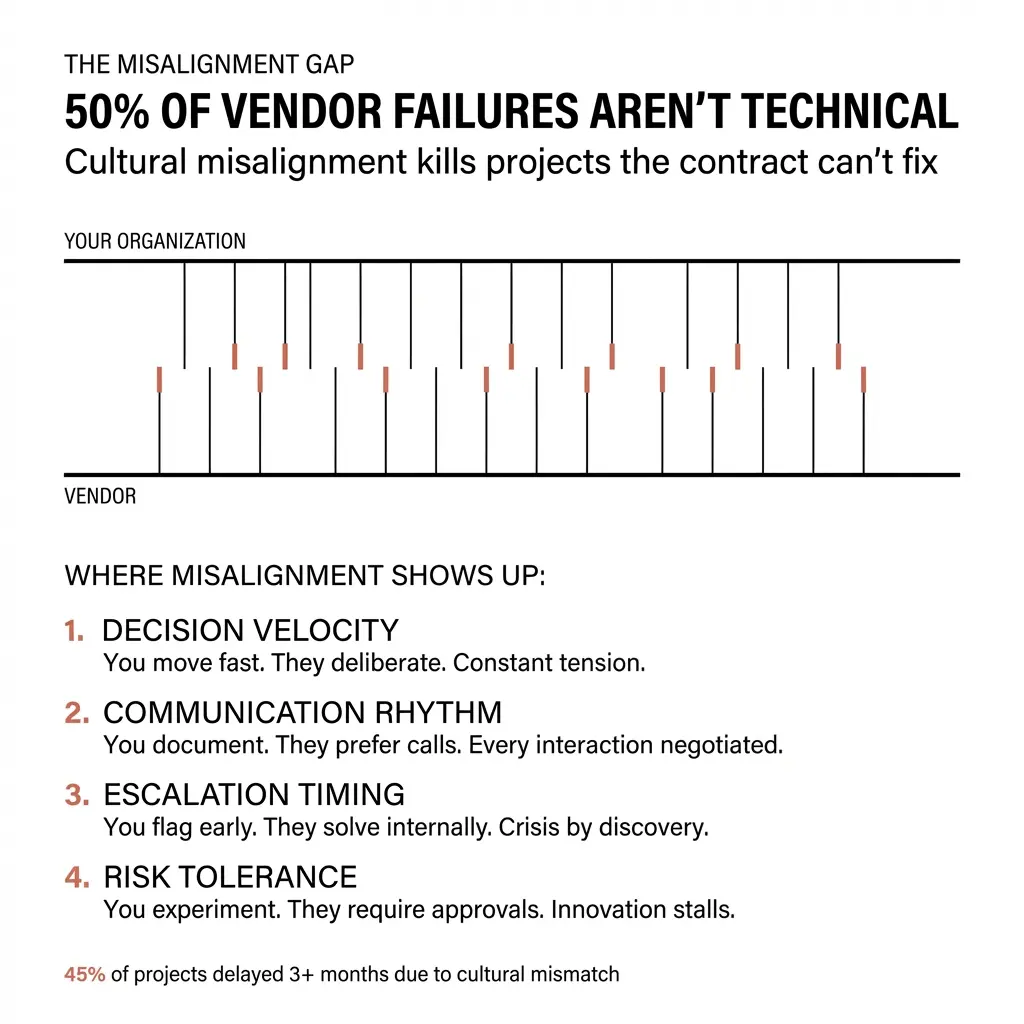 Decision velocity: Your team moves fast and expects vendors to match the pace. Your vendor built their process around deliberation and consensus. Neither approach is wrong, but the mismatch creates constant tension.