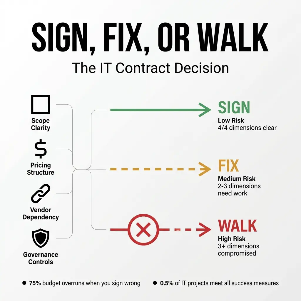 You need a framework that addresses the actual risk factors in IT contracts: scope clarity, pricing structure, vendor dependency, and governance controls.