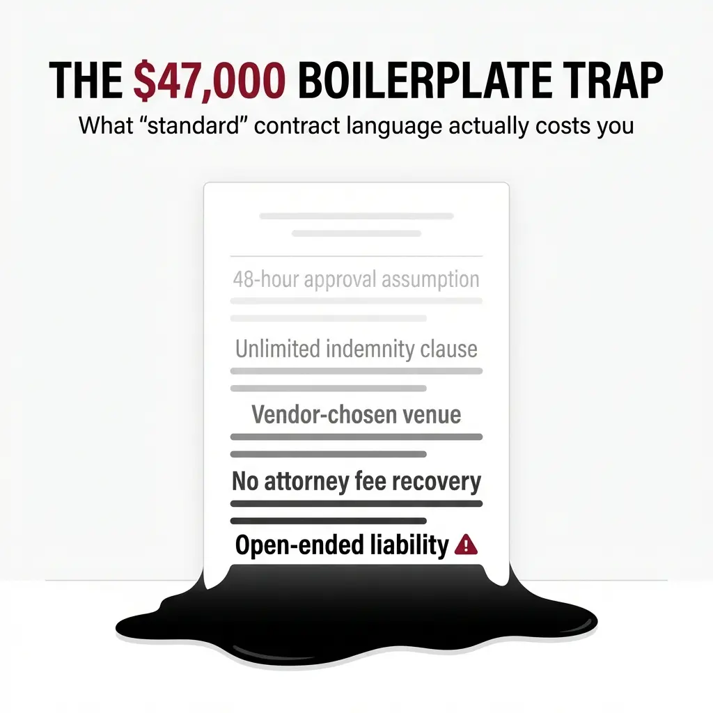 The $47,000 surprise invoice, the unlimited indemnity exposure, the venue clause that makes enforcement impractical—these aren’t accidents or oversights.